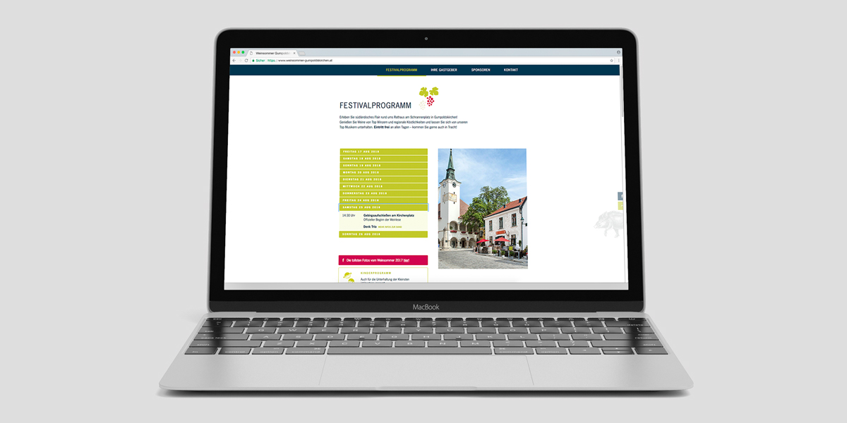 Unsere kleinen Event-Websites sind unkompliziert, funktionell und hübsch anzusehen. Ohne viel Schnick-Schnack heißt hier die Botschaft: Komm und genieße den Weinsommer! Das Programm und alle Infos sind übersichtlich dargestellt und leicht zu finden.